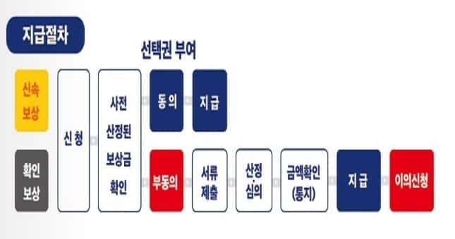 손실보상금 지급은 신속보상, 확인보상, 이의신청의 3단계로 진행됩니다.