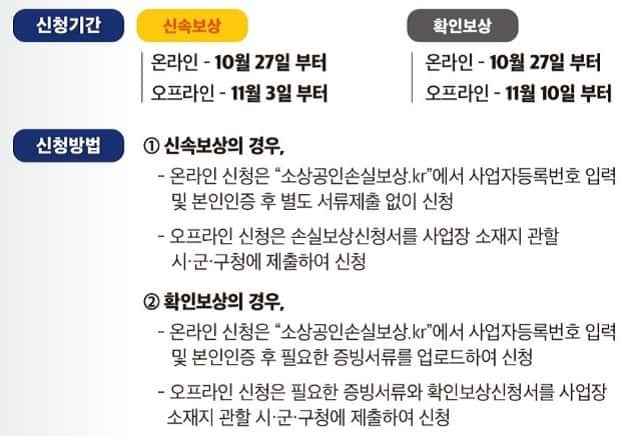 확인 보상은 신속 보상과 동일하게 27일부터 온라인으로 신청할 수 있고, 오프라인 신청은 다음 달 10일부터 가능합니다.