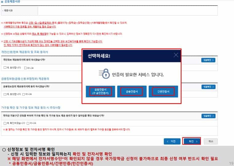 국가 장학금 신청 및 서류 제출방법 등 확인 후 팝업 하단 확인 버튼 누름