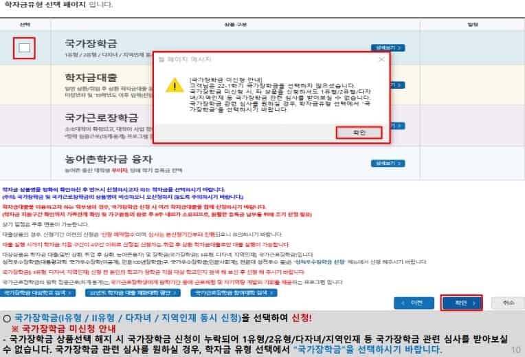 학자금 유형 선택 국가장학금과 국가근로장학금 학자금 상품명이 비슷하므로 오신청하지 않도록 합니다.