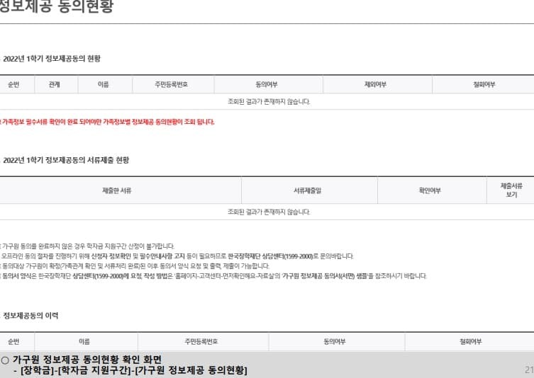 신청시 입력한 가구원의 가구원 정보 제공 동의 현황 반드시 확인 및 미동의 시 기한 내 완료해야 국가장학금 받을 수 있습니다.
