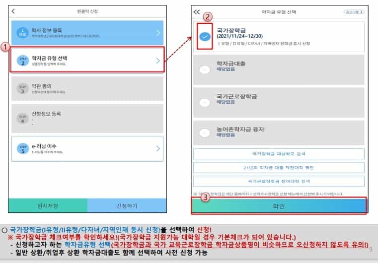국가장학금 한눈에 보기 필수 단계 이므로 미확인 시 진행 불가입니다.