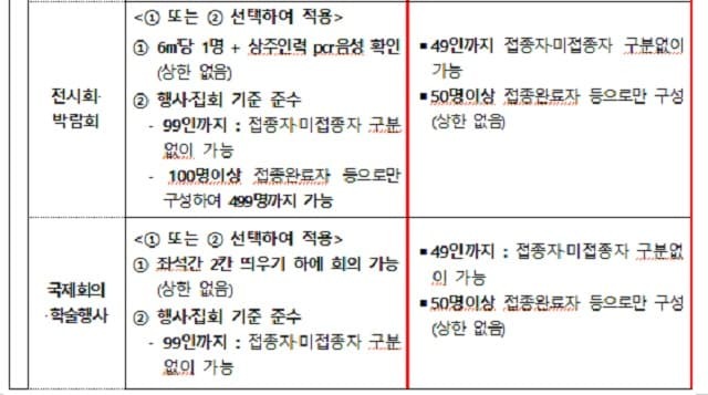 대규모 행사 집회 인원 기준도 강화되어 50인 이상인 경우 접종완료자등으로로만 구성해 299명까지 가능합니다.