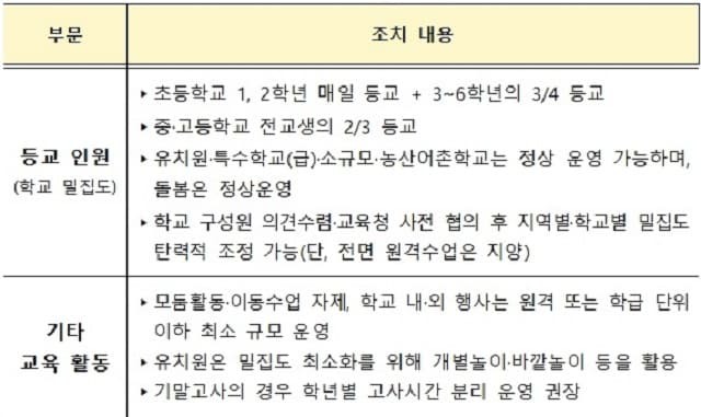 수도권 모든 학교와 비수도권 과대 과밀학교는 밀집도 2/3 수준으로 조정하고 지역별 감염 상황을 고려해 지역별 학교별 탄력적인 조정이 가능합니다.