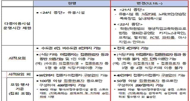 대규모 행사 집회 인원 기준도 강화되어 50인 이상인 경우 접종완료자등으로로만 구성해 299명까지 가능합니다.