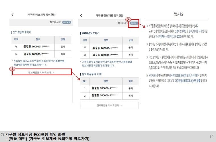 신청시 입력한 가구원 가구원 정보 제공 동의 현황 반드시 확인 및 미동의 시 기한 내 완료해야 국가장학금 수혜 받을 수 있습니다.