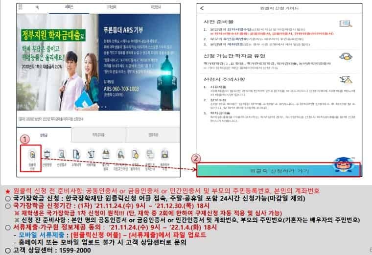 국가장학금 신청 : 한국 장학재단 원클릭 신청 어플 접속, 주말 공휴일 포함 24시간 신청 가능 마감일 제외