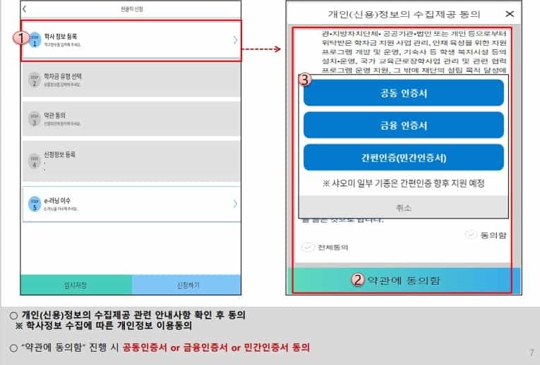 개인정보를 제공하는 사람 대학생의 부모 또는 배우자 공동인증서/ 금융인증서/ 민간인증서 인증