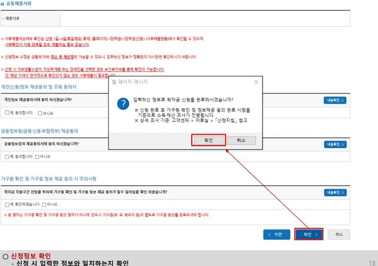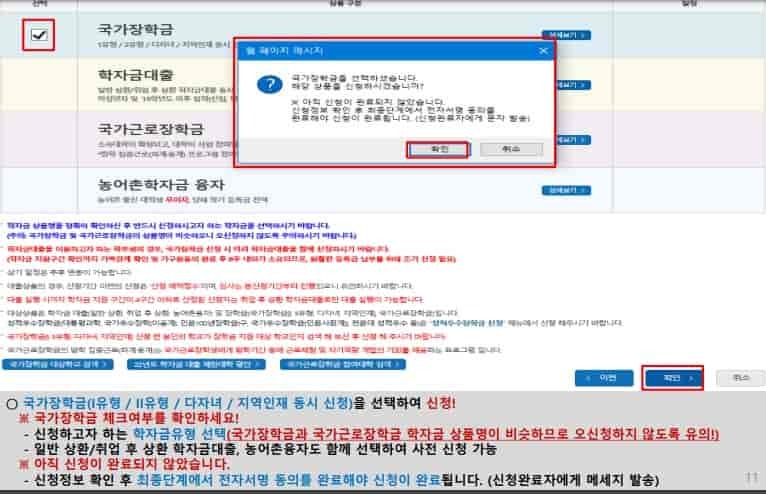 국가 장학금 신청 및 서류 제출방법 등 확인 후 팝업 하단 확인 버튼 누름
