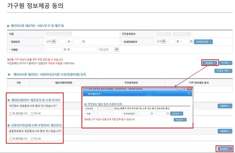 장학금 - 학자금 지원구간 - 가구원 부모 배우자 정보 제공 동의 하기 클릭