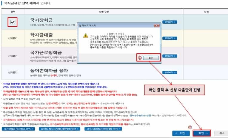 학자금 유형 선택 국가장학금과 국가근로장학금 학자금 상품명이 비슷하므로 오신청하지 않도록 합니다.
