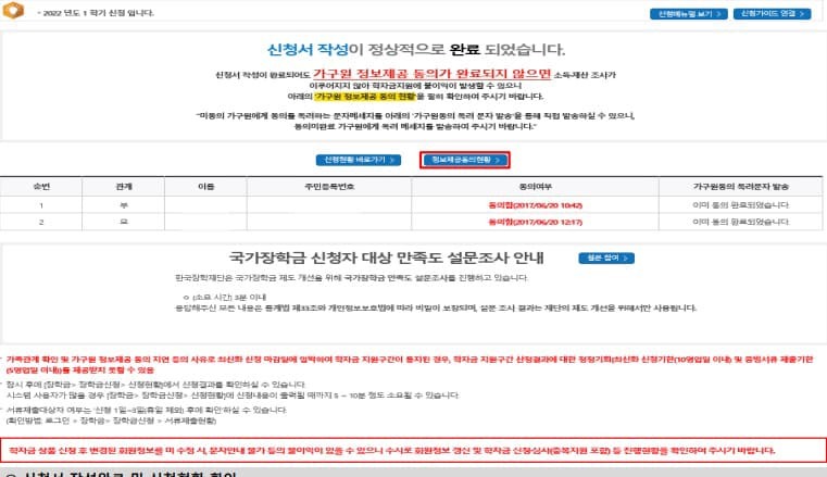 신청시 입력한 가구원의 가구원 정보 제공 동의 현황 반드시 확인 및 미동의 시 기한 내 완료해야 국가장학금 받을 수 있습니다.
