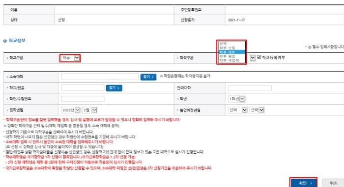 소속대학 오신청 학적 오신청 발생시 심사에 오류가 발생할 수 있어 정확히 입력합니다.