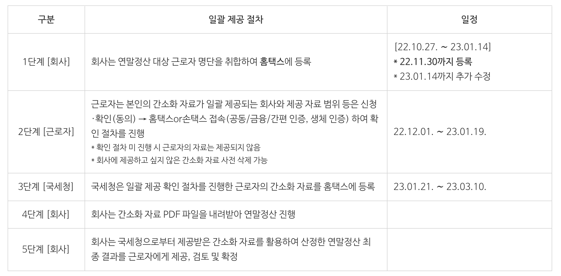 - 우선, 회사는 연말정산 대상 근로자 최종 명단을 홈택스에 1.14.까지 등록해야 합니다.